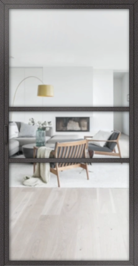 Die Tür ist in drei große Glasfelder unterteilt, die durch schmale Querstreben getrennt sind. Diese klare Linienführung sorgt nicht nur für eine strukturierte, moderne Optik, sondern lässt auch viel Tageslicht durch, was den Raum heller und freundlicher wirken lässt. Das verwendete Glas ist leicht satiniert, wodurch es sowohl Lichtdurchlässigkeit als auch eine gewisse Privatsphäre bietet.